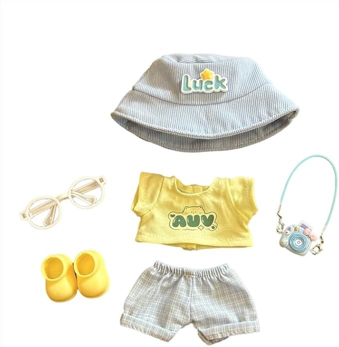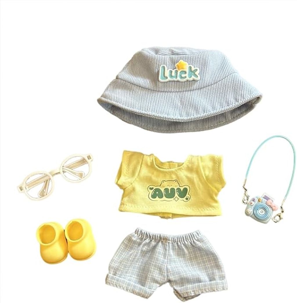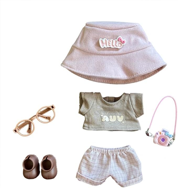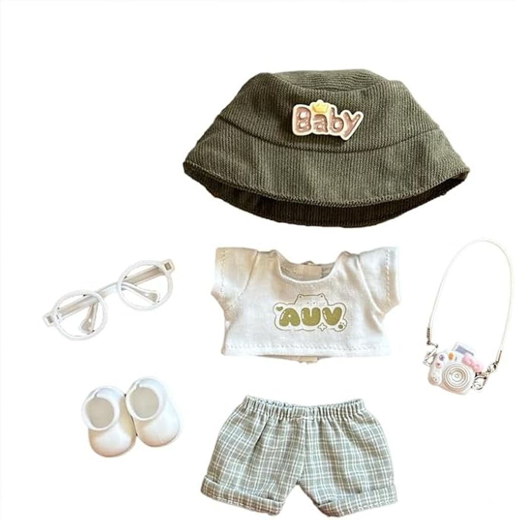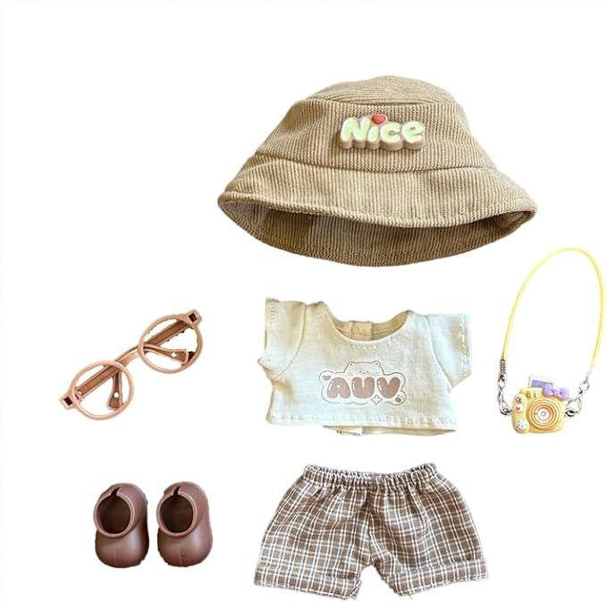for labubu 服 ラブブ 服人形なし ぬいぐるみ 服 ぬい服 15cm 17cm ラブブ 着せ替え 6 点セット 帽子+服+ズボン+靴+メガネ+カメラバッグ DIY アクセサリー 人形の服 ファッショナブル ins スタイル かわいい 茶色 並行輸入品